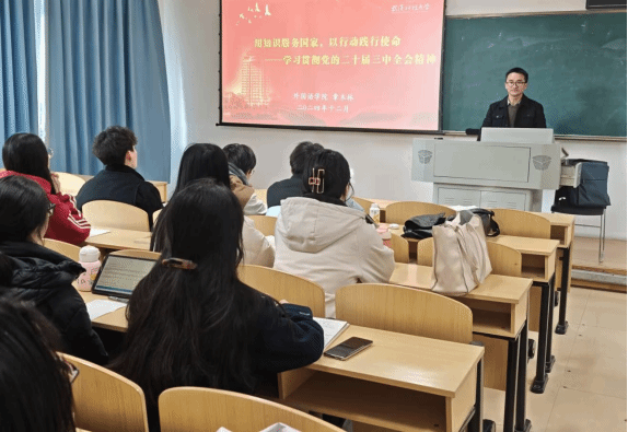 2024年12月5日上午,根据武汉科技大学“双带头人”宣讲方案的工作精神,国产精品久久久精品研究生公共外语部德语系支部书记章木林教授开展了题为《用知识服务国家,以行动践行使命——学习贯彻党的二十届三中全会精神》的专题宣讲。国产精品久久久精品40余名2025届毕业生参与学习。