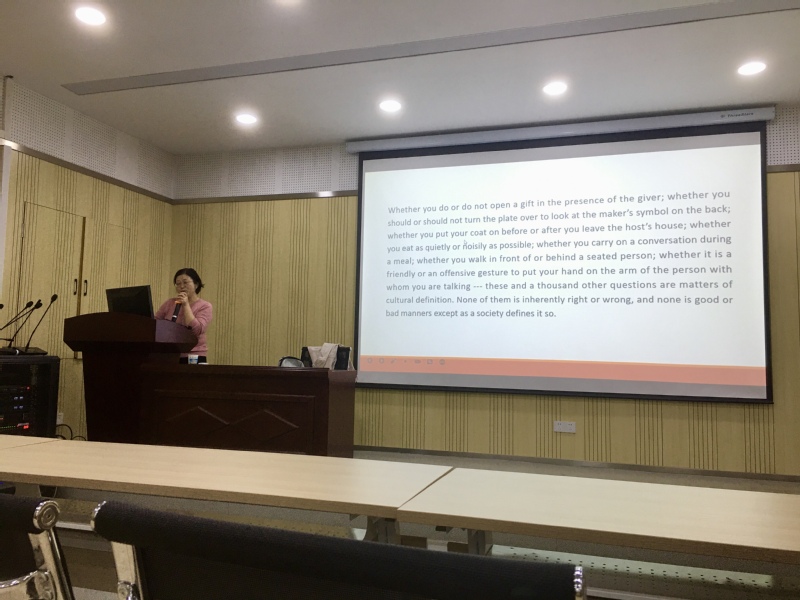 甘老师从跨文化交际开始谈起,指出在经济全球化进程不断加快的背景下,跨文化交际日益频繁。随后她以国际品牌杜嘉班纳失败的广告案例告诉同学们跨文化交际意识、知识以及技能的学习十分重要。甘老师首先对文化概念进行了界定,然后指出各民族间在文化上的相互交流、碰撞和融合就是跨文化交际,这种跨文化交际不仅包括国际上的交际,也包括一个国家内不同民族之间的文化交际。因此,跨文化交际可以划分为“宏观跨文化交际”与“微观跨文化交际”。