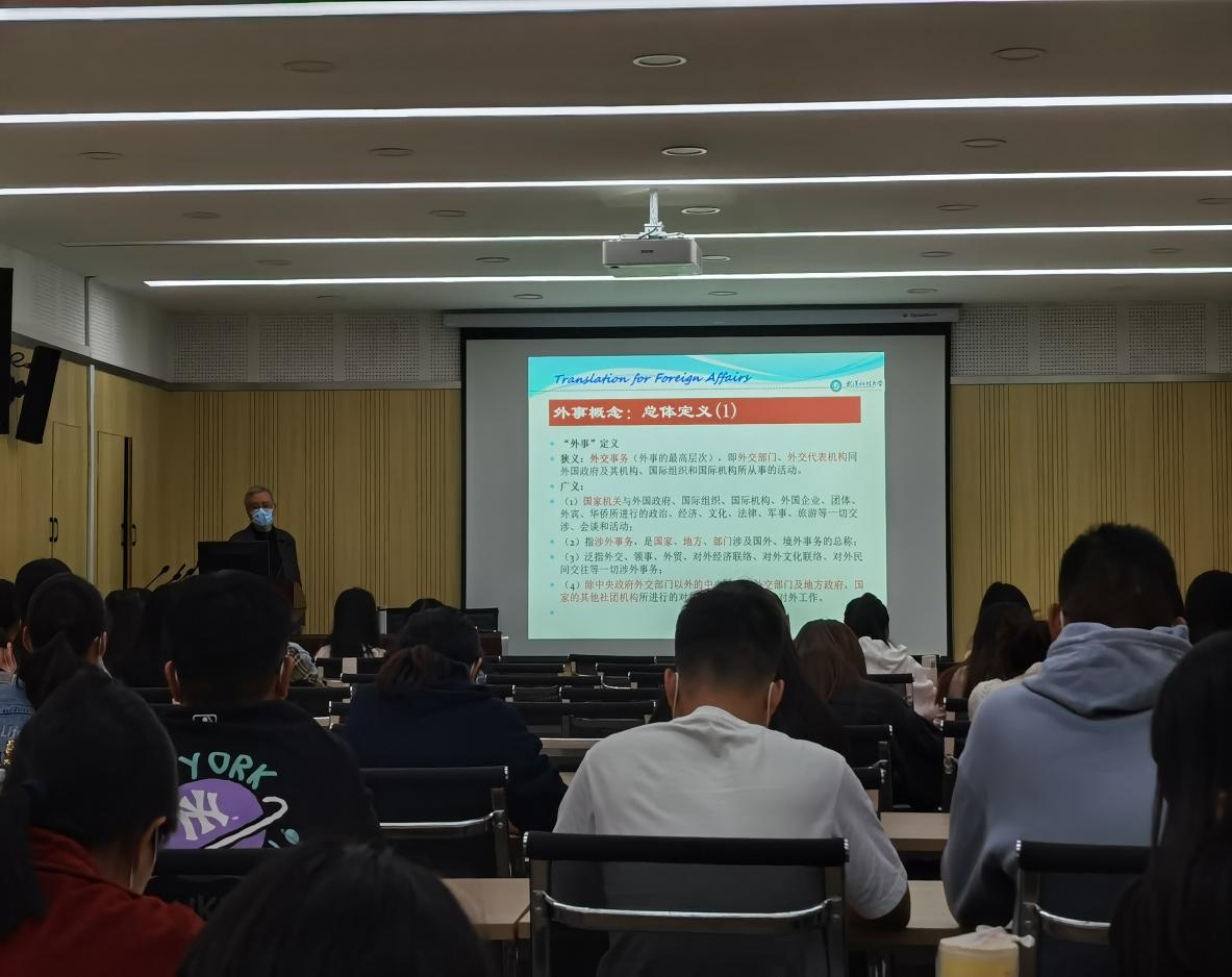 首先,耿教授讲解了外事的定义。外事,从狭义上说,指外交事务(外事的最高层次),即我国政府的外交部门、外交代表机构同外国政府及其代表机构、国际组织及机构之间开展的相关活动。广义上泛指外交、领事、外贸、对外经济联络、对外文化联络、对外民间交往等一切涉外事务。接着,耿教授讲解了外交的内涵,包括外交定义、外交实践、外交特性、中国外交体系、外交学体系、外事机构、外事工作、外事接待以及外事礼仪等,让同学们全面了解了外交及其相关内容。其间,耿教授特别提及了他在我校国际合作与交流处的工作经历。作为外事机构,我校国际合作与交流处承担着诸多外事职责,比如规划和协调我校国际合作与交流工作、组织因公出访、接待外事来访、推进学校国际化战略等。谈到外事工作时,他分享了自己出访澳大利亚、邀请外方参加我校校庆等工作经历,并以此提醒同学们,从事任何工作,尤其外事工作时,务必要小心细致,注重细节。耿教授还介绍了几位著名的国家领导人专职翻译,鼓励同学们以他们为榜样,努力学习。