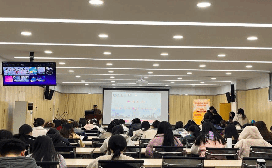 宣讲人何清围绕译国译民集团的发展概况、公益实习、校企合作、图书翻译、企业文化、校招岗位等多个方面展开风趣幽默的介绍。