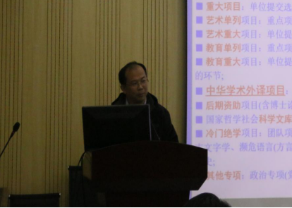 李敏杰就中华学术外译项目的特点,对项目的申报流程进行了全面的分析解读,主要包括项目的申报要求、申报流程及注意事项。他重点讲解了外译项目的选题方向、申报团队组建以及与中外出版社沟通合作等重要内容,并同与会教师就项目申请的相关问题进行了探讨。