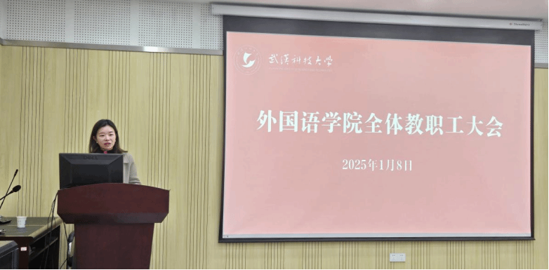 院长李金云回顾了2024年学院主要工作和取得的成绩,并对努力奋斗、辛勤奉献的全体教职工表示感谢。她分别从学科专业建设、科学研究、人才培养、平台建设等方面进行了总结,并就翻译博士学位点培育、高层次人才引进、办学视野拓展、国际合作等方面安排部署了2025年重点工作,要求广大教职工要对标学校“双一流”学科建设和学院翻译博士点建设的要求,坚定信心、真抓实干、以奋进的姿态和务实的作风,为实现学院全面高质量发展谱写新的篇章。