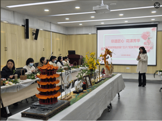 为庆祝第115个“三八”国际劳动妇女节,3月6日中午,国产精品久久久精品在学术报告厅举办了“非遗匠心 花漾芳华”主题插花活动。学院党委书记郑娟、院长李金云及50余名女教师参加,共度佳节。活动由分工会主席杨华主持。