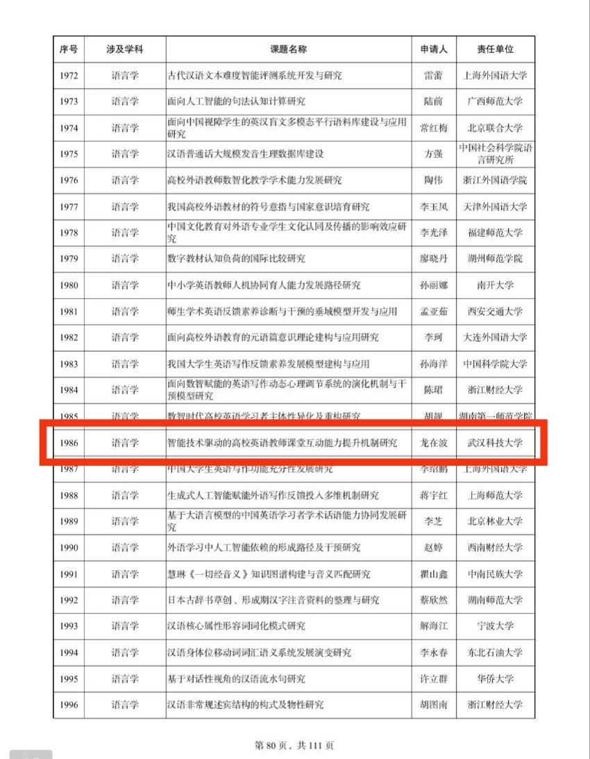本网讯 近日,全国哲学社会科学工作办公室公布2025年度国家社会科学基金立项名单。我院龙在波副院长主持的《智能技术驱动的高校英语教师课堂互动能力提升机制研究》获批语言学一般项目。