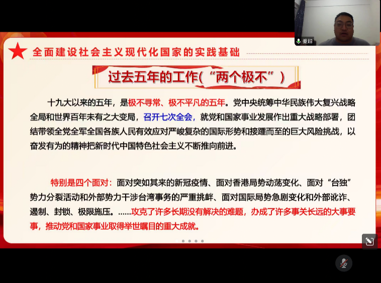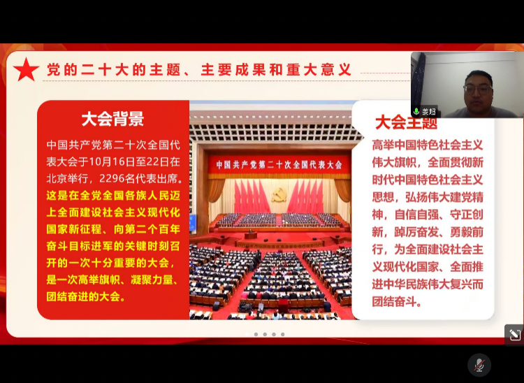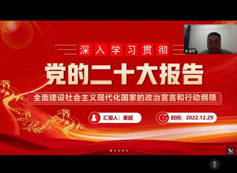 武科大网讯(通讯员陈敬洋 丁虹)12月29日晚,我院本科第一、第二、第三党支部以线上的形式联合开展了以“深入学习贯彻党的二十大报告”为主题的学习交流会。会议由本科第一党支部成员孔庆乐主持,本科第一、第二、第三党支部全体党员和预备党员参加。校辅导员宣讲队成员、我院2019级辅导员姜超受邀以“全面建设社会主义现代化国家的政治宣言和行动纲领”为题进行专题宣讲。
