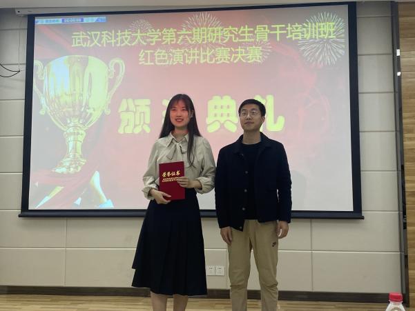 武科大网讯(通讯员刘瑞)4月6日晚,武汉科技大学第六期研究生骨干培训班红色演讲比赛决赛于黄家湖校区恒大管理学院80307圆满结束。我院22级翻译硕士研究生赵孟婷在此次比赛中荣获一等奖。 本次演讲比赛以“奋进新征程 青春勇担当”为主题,由党委研究生工作部和研究生院主办。经前期各组筛选,最终共13名同学入围决赛。赵孟婷以《守望信仰的高山》为题,从自己的亲身经历出发,联系家乡近年的变化,歌咏祖国发展道路并号召新时代年轻人坚定理想信念,共同促进祖国的进一步发展,展现了出色的语言表达能力与号召力,荣获决赛一等奖。