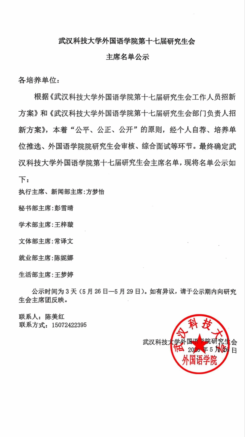 武汉科技大学国产精品久久久精品第十七届研究生会主席名单公示